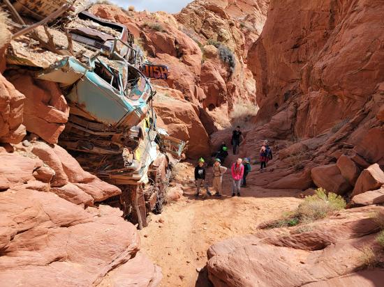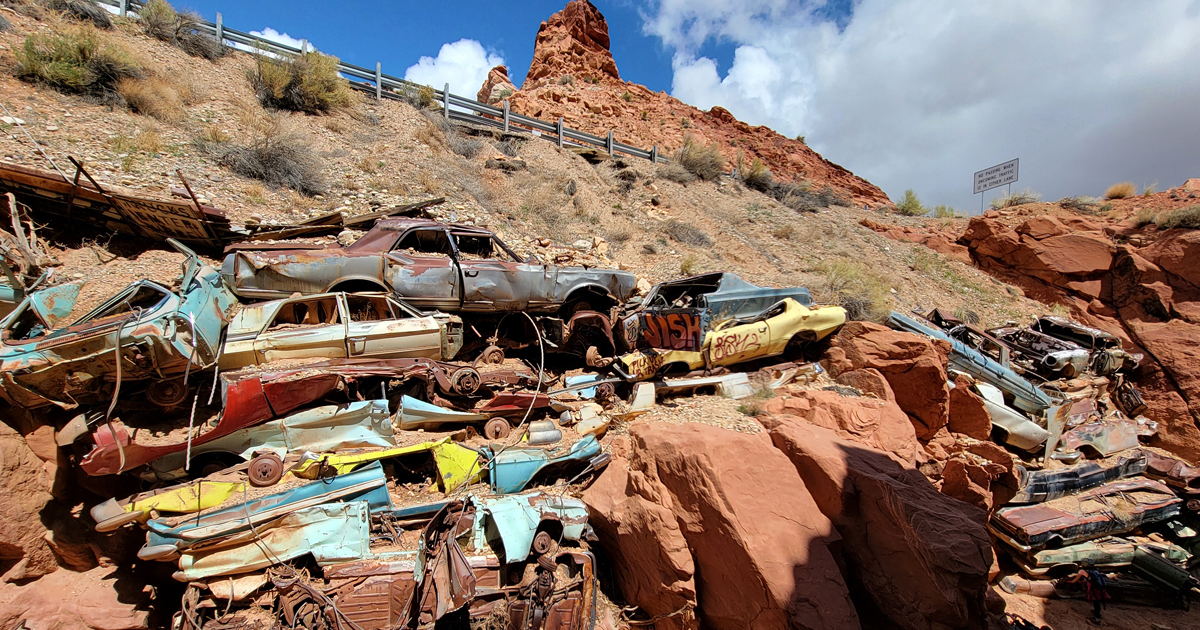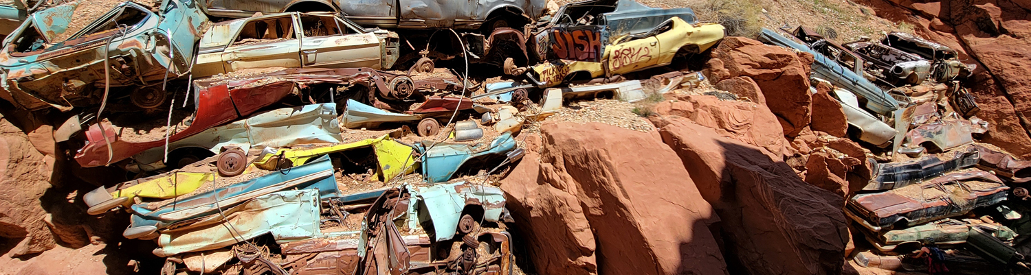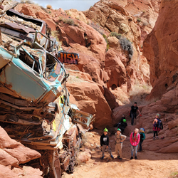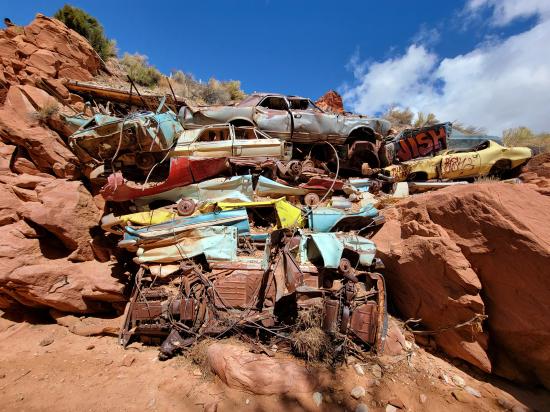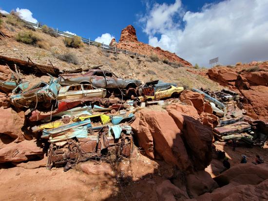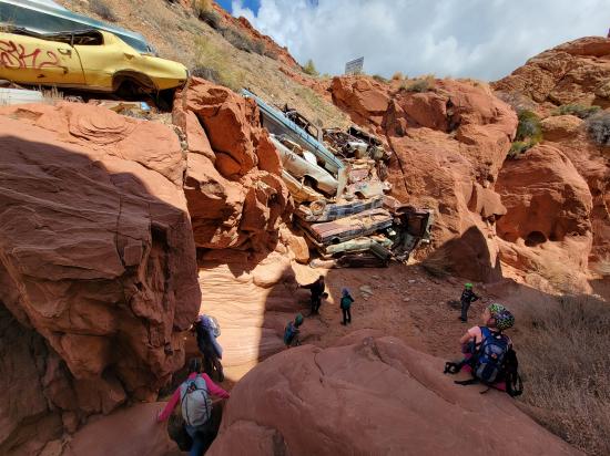 Catstair Canyon is a short, roadside canyon in southern Utah featuring a unique retaining wall made of stacked cars and ancient petroglyphs and pictographs. It's a convenient stop along US-89 between Kanab and Page, offering a beginner friendly technical canyoneering route that includes scrambling, down-climbing, and 1 or 2 rappels. The canyon's most distinctive features are the car retaining wall and the historical rock art located near the end of the canyon.