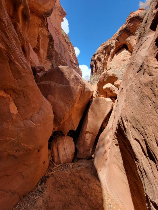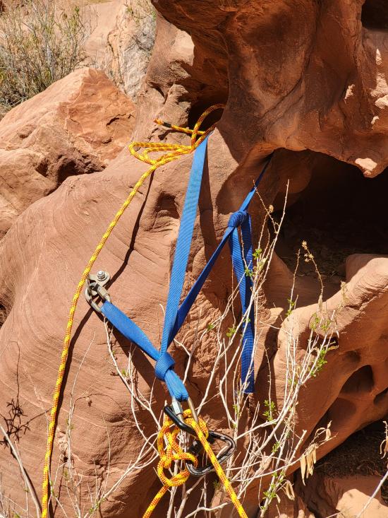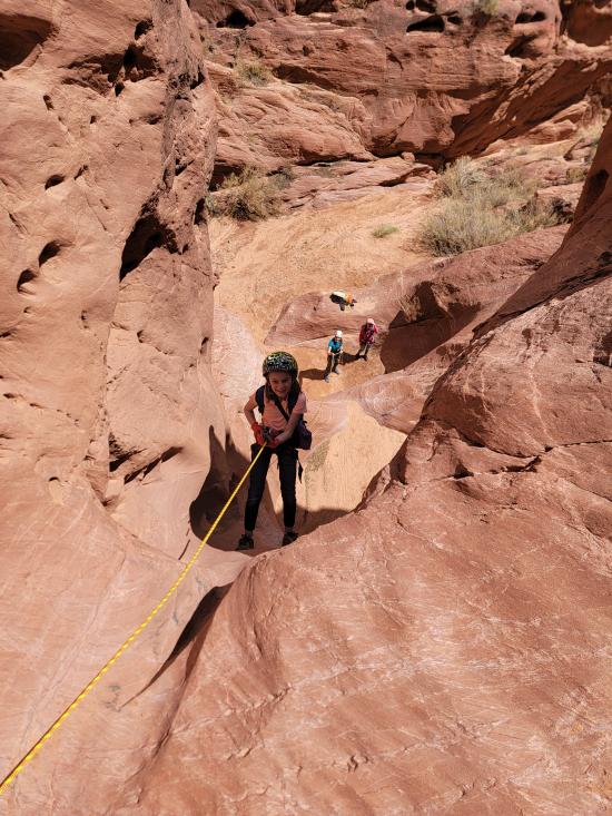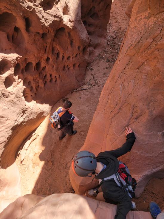 Shortly after the first drop is the final drop. Most beginners will want to rappel this drop, but more advanced canyoneers will likely choose to downclimb it. Sling a boulder with 50 ft of webbing, then rappel 30 ft down an awkward crack.