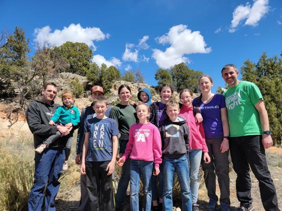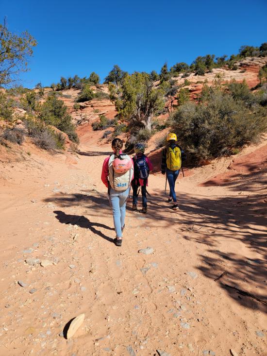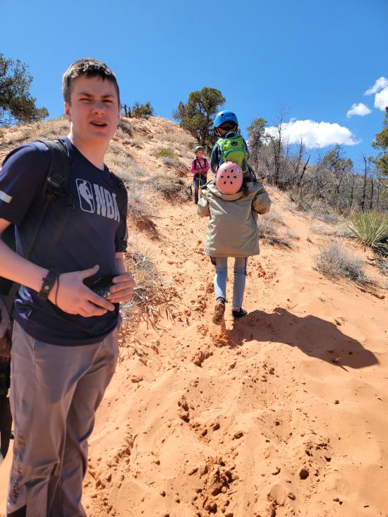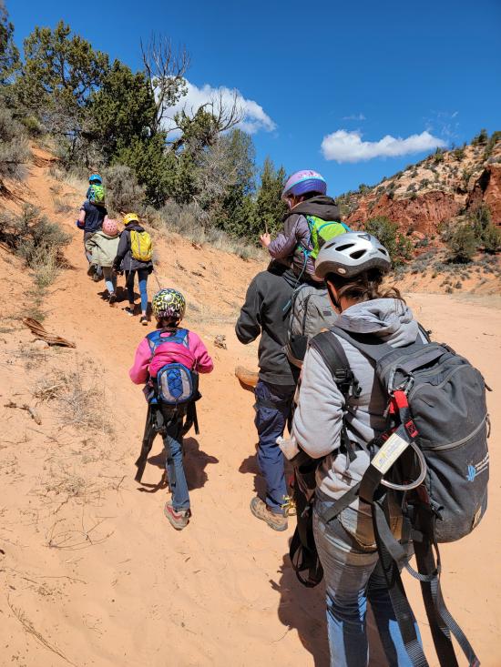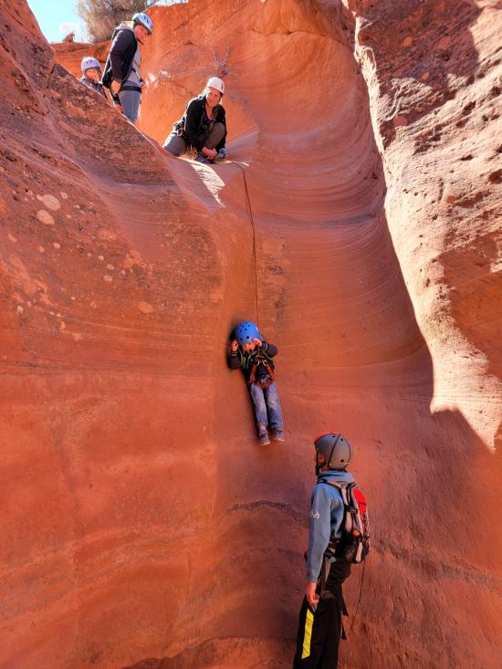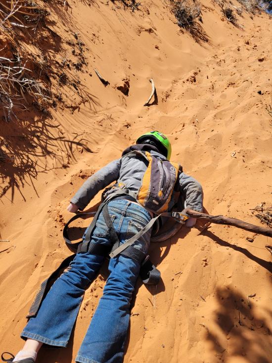 This was our last adventure on our Spring Break trip to Kanab. We had previously done just the lower portion of Dianas Throne Canyon and didn't realize that the upper canyon was as good as it was. The kids were worn out from a week of camping and adventuring, so the road walking to get to the top of the canyon was rough for them. We played the "fortunately unfortunately" story game on the hike in, which helped them forget how tired they were. Once we reached the canyon, they were all smiles again. We really liked the canyon and how pretty it was. Everyone took off their harnesses prematurely before the last rappel, so I climbed half-way down, and we lowered the kids from the top to the middle to the bottom. Then Ondy used the handline to climb down and I climbed down without the rope. On the hike up the sand dune, we left the wash earlier than we should have. The sand was so steep, that we had several kids slide down in spots and we had to use a rope to pull them back up to us. Once we made it up to the ridge, the kids were really dragging their feet, so we clipped a rope onto their beltloops, and I towed them up the hill.