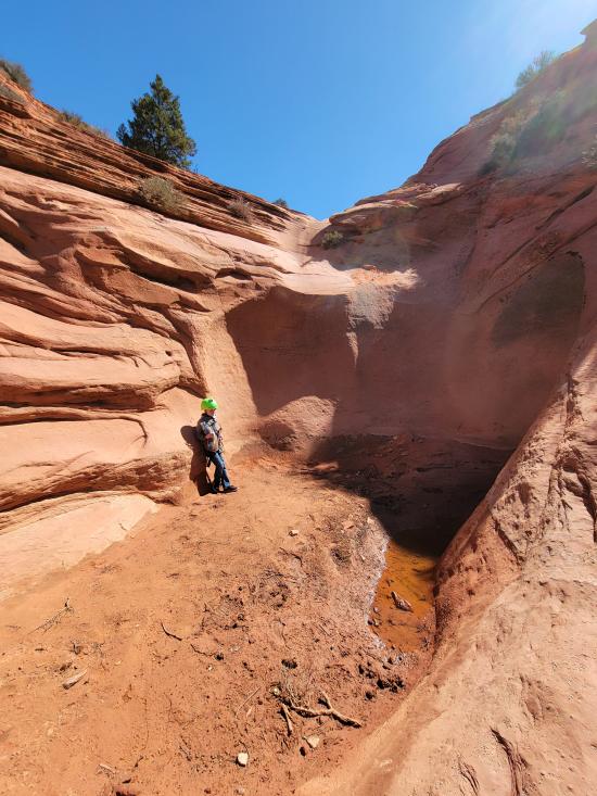 The canyon bends right (northwest) and slots up again. There are some minor obstacles including a 5-foot climb over a chockstone before the canyons bends left. Rappel 15 ft over an overhanging lip into a round room.