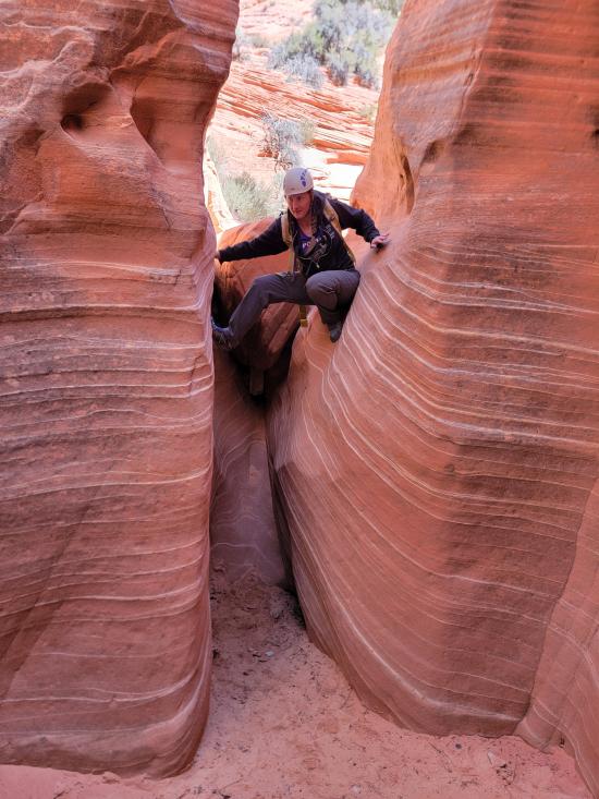 The final narrows has a swirly downclimb under a chockstone then a drop. Rappel 20 ft from a 2-bolt anchor. This drop can also be downclimbed. Continue through the narrows to one final, 5-foot drop that most will downclimb but some will rappel. The canyon ends dramatically and spits you out in a wide sandy wash.