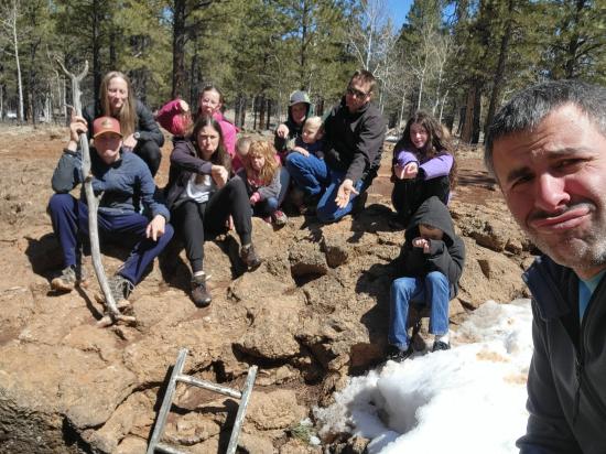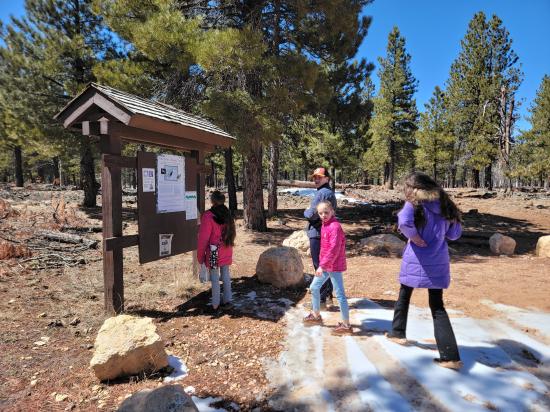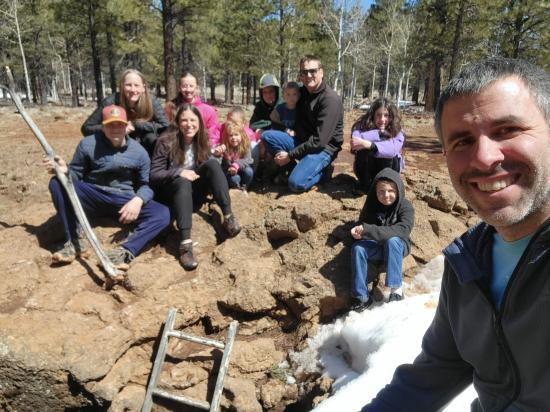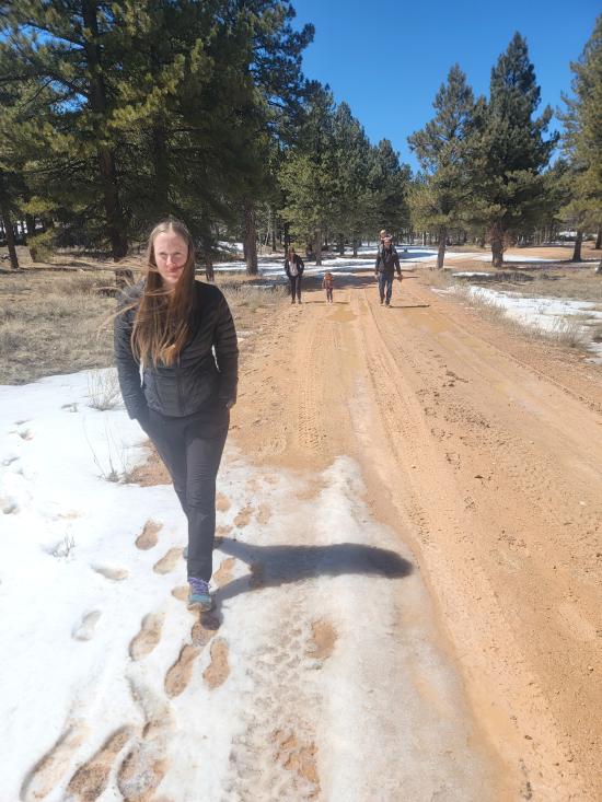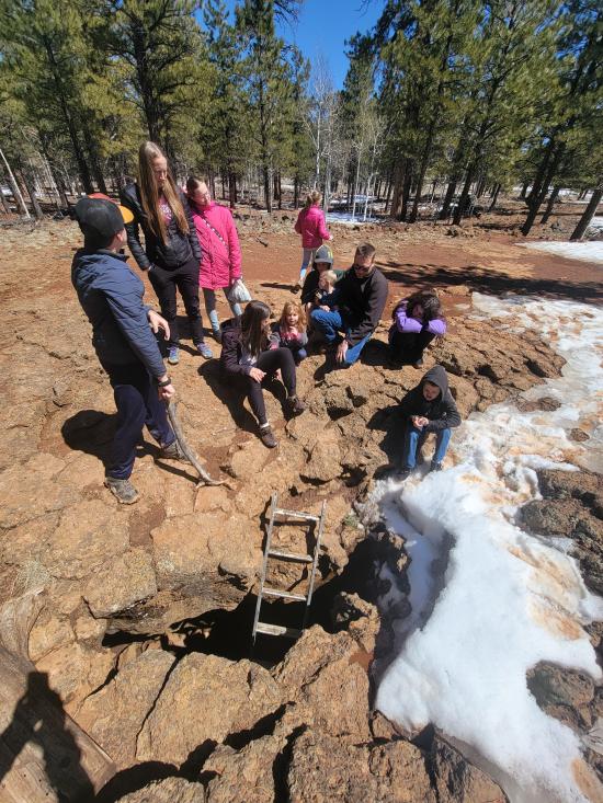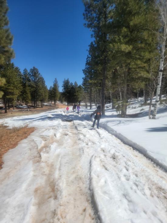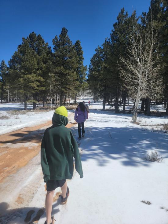 On our way home from Spring Break, we stopped at Bowers Cave. We only made it about 100 ft onto the dirt road before it got too snowy and muddy to continue. There was a guy we didn't know who was trying to dig his car out of the mud. He had driven off the road to turn around and gotten very stuck. All the adults plus a couple of the older kids helped push him back onto the road. He was lucky we showed up because he was a long way from civilization. Since we couldn't take the vans down the dirt road, we decided to walk instead. It was only 0.6 miles. When we got to the cave, there was a an information sign that said that the cave was closed through the end of April due to hibernating bats. We were pretty bummed that we couldn't go in the cave but also a little bit relieved because it was very wet and muddy. We hiked back to the cars then continued driving home, stopping at Cedar Breaks National Monument on the way.