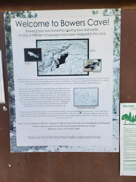 While Bowers Cave has become popular with visitors to Dixie National Forest, it is also frequented by seven species of bats, including two State sensitive species-the Townsend's Big-eared bat ad the Fringed Myotis. Other species of bats observed at Bowers Cave include the Long-eared Myotis, Big Brown bat, Long-legged Myotis, Western Small-footed Myotis, and the Hoary bat.