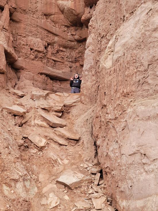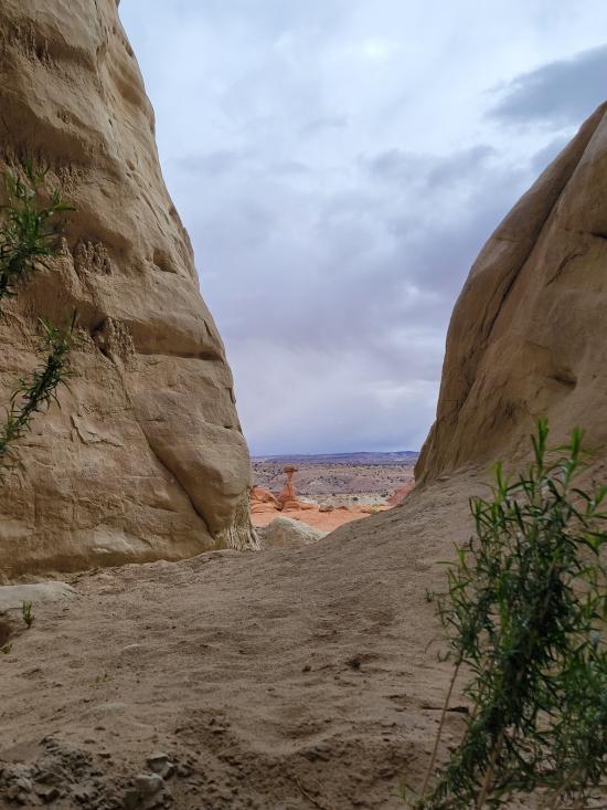 Because of the Mangum wildfire, the air was full of smoke during our trip. We hiked up to the first group of hoodoos and played around. We explored a little bit before heading around the corner to the second grouping of hoodoos. We had fun with some forced perspective photography, making it look like Tara was standing on top of a giant hoodoo when in reality she was on the ridge behind the hoodoo.