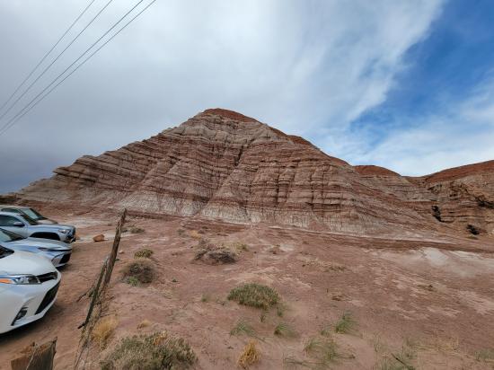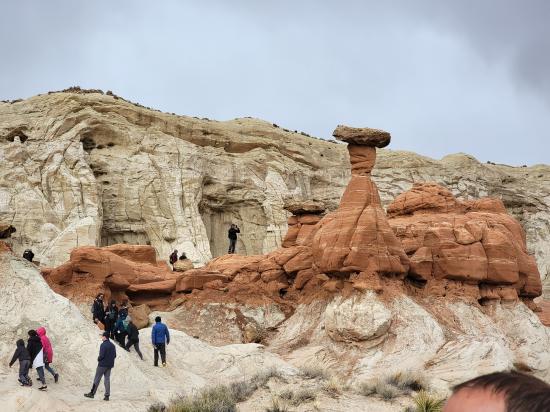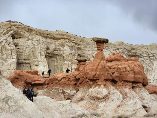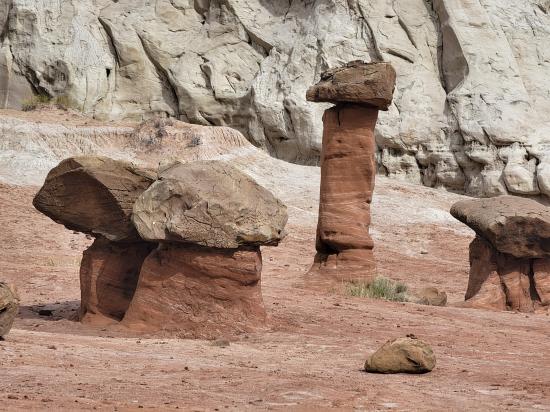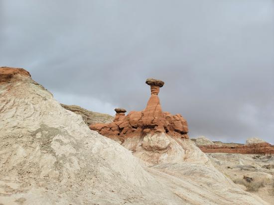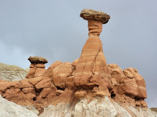 The Toadstool Hoodoos are an amazing collection of hoodoos, badlands, and other interesting rock formations found in the area located between the Cockscomb Fault and the southern section of Cottonwood Canyon Road just north of US 89. The base of Toadstool Hoodoo is Entrada sandstone and the caprock is Dakota sandstone. Its unique shape is due to erosion.