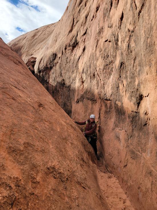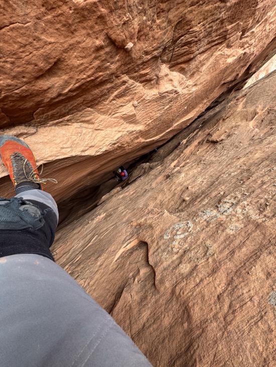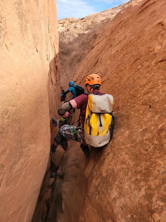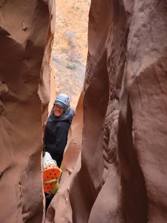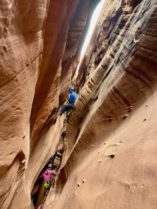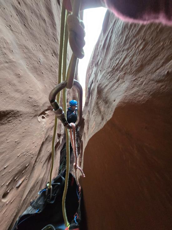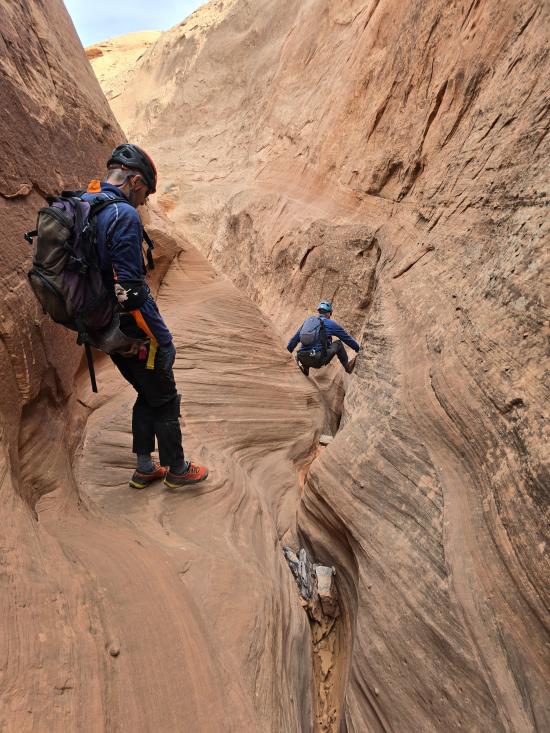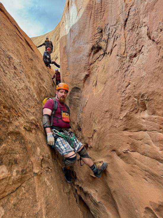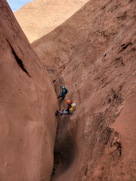 We didn’t have any beta with us since this was an add-on, so we route-found our way to the head of the canyon. We stemmed through the upper section, then did some walking to get to the bottom narrows. The lower narrows were 100% stemming. We galumphed and stemmed as fast as we could until we hit a section about halfway down with two big silos. The second silo was too big to cross at height, so Mark and Tom dropped down and crossed the silos low. I was pretty tired by that point and didn’t think I could reverse the elevator, so Zack and I stayed put.