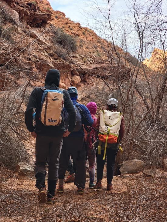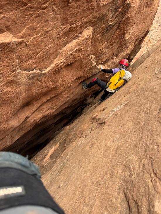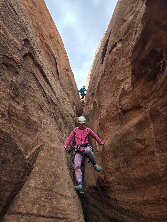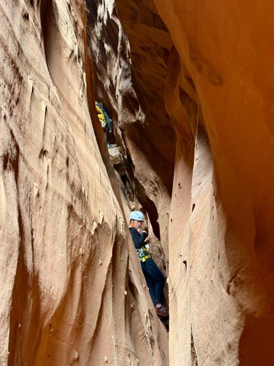 We did three canyons, starting with Burrly Canyon. We cruised through the first part. Some of the beta said the canyon was rated PG, but the routes we took were in the easy R category. Ondy was not in a good headspace and struggled a bit with some of the downclimbs. We really liked the big elevator near the end. On the exit hike, Mark and Anthony climbed up first then lowered the rope so the others could use it as a handline.