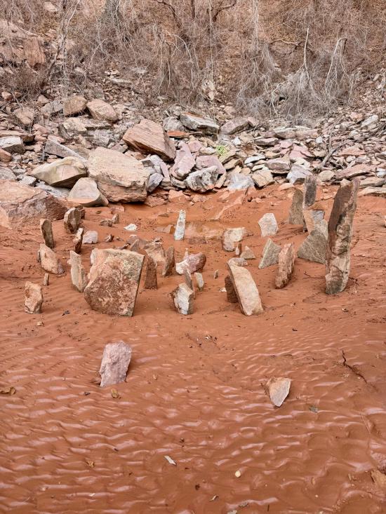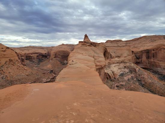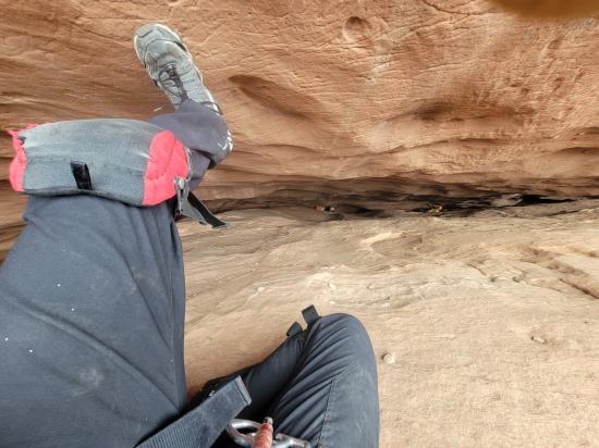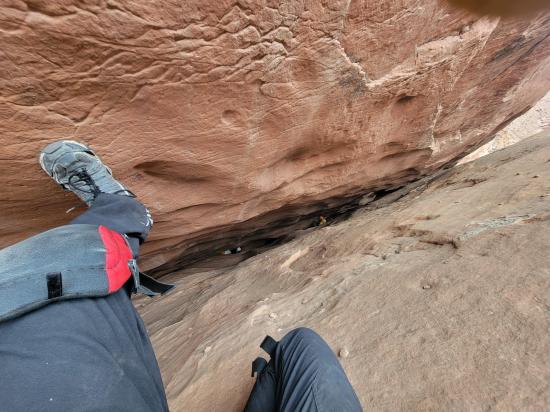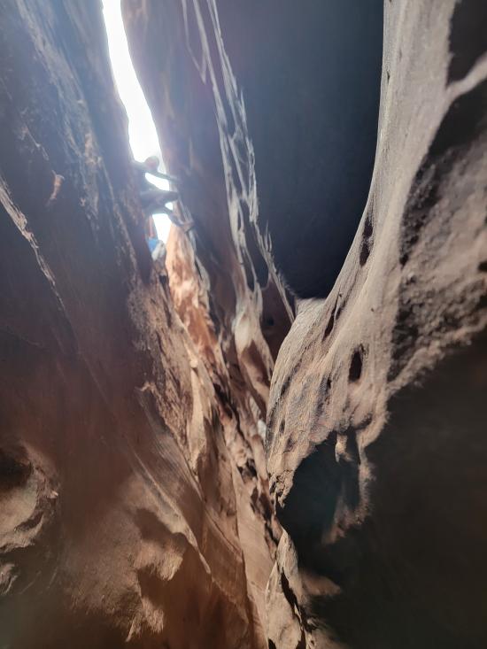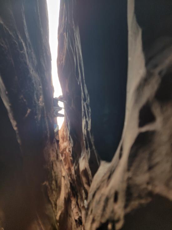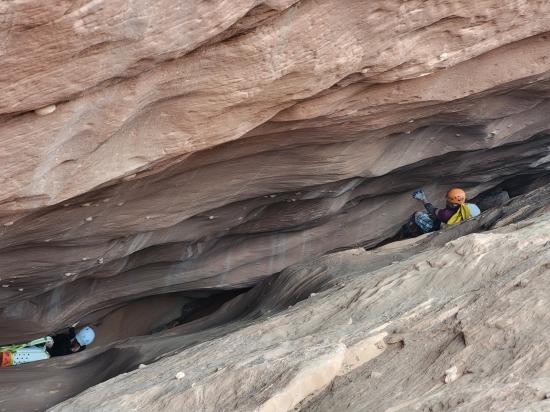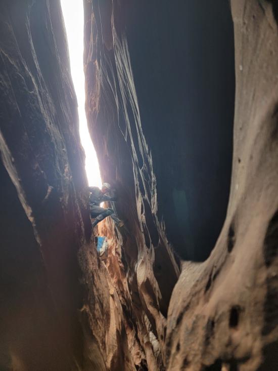Tom stopped about 20 feet past us and then came back up. He climbed the point between the two silos, which looked incredibly tricky and physical. Mark went all the way to the bottom, then reversed everything. He climbed up too soon and couldn't cross the big silo to come back, so he had to drop down to the ground and then come back up. He was pretty winded by the end of it. I think that’s the first time I’ve seen him tired. He tried the elevator that Tom went up but didn’t like it, so he did the skinny one closest to us instead. We reversed back to the top of the bottom narrows. Then we exited and found a route up the nose to the rim. By that point, it was the last of our light. We road-walked back to the cars, where we met up with the other vehicle and drove back to camp.
