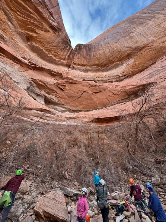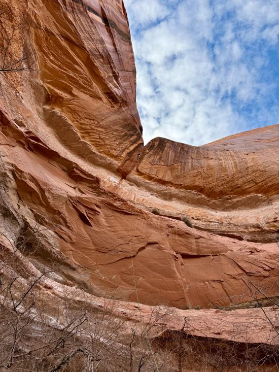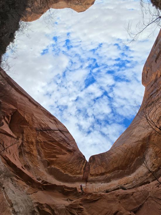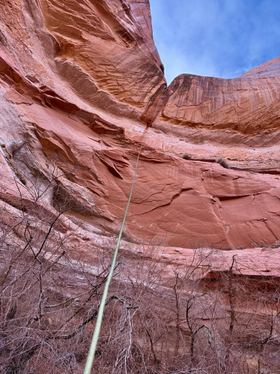 Back at the car, we ate lunch. Then we dropped into Swirly Canyon. Most of the canyon involved stemming quite high in the air, and the ground below was very squeezy. A few people chose the bottom route, and the rest of us stayed high. Near the end, there’s a big elevator climb to get down to the rappel point. The final rappel was between 250 and 300 feet tall. I went last and converted the rappel from a stone knot to a knot block with a pull cord. After I went over the edge, I tossed the pull cord, and it got stuck on some trees. Anthony untangled it, then we got the pull cord going the right way so I could drop straight down without twisting the two ropes together.