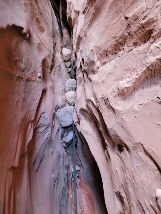 Anthony and Ryan hiked ahead and descended Swirrly Canyon, retrieved the rope, and reversed the canyon. They said it was extremely annoying to pull up the extra-long rope from the pinchy rappel point.