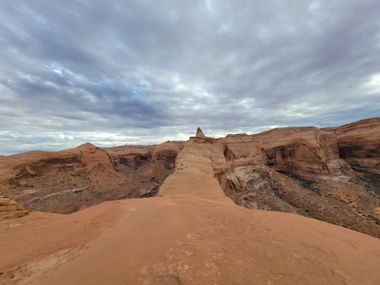Once we got up on top of the fin, Ondy started getting vertigo really badly and really struggled with the heights. The walking part was wide, but it got slopey in spots and had huge drop-offs on both sides. We bunched up around her to block her peripheral view, and that seemed to help.