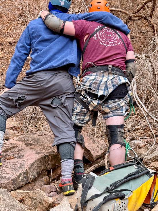 At the bottom, we started to pull the rope, and the pull cord broke with not very much tugging. We talked through our options and decided not to ascend the rope since there was a large extension of webbing at the top that would stretch during ascent and possibly damage the rope. So we all hiked back to the car instead, and Anthony and Ryan volunteered to do the canyon a second time to retrieve the rope.