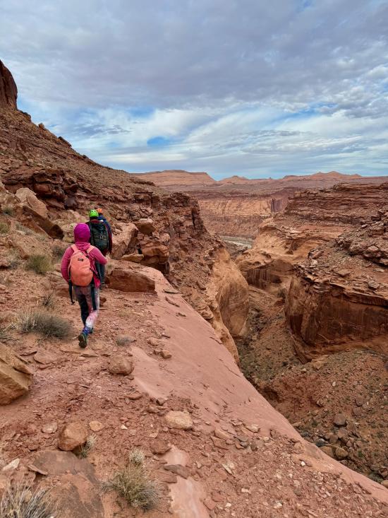 On the exit hike, Ondy once again had a really hard time with the heights. At one point, she sat down with her head between her knees, just bawling. It was definitely a mind-game thing for her. The walking wasn’t tricky, but it was windy and cold and she kept getting in a bad headspace. I clipped a rope onto the waistband of my pack and let her hold onto that, and Tre and I distracted her while we hiked, letting her tell us about some of the recent dates she has been on.