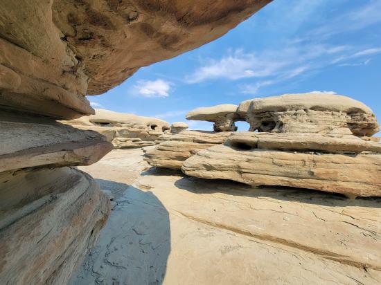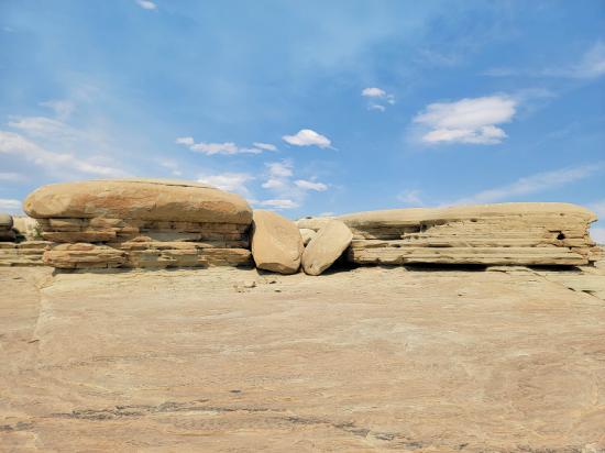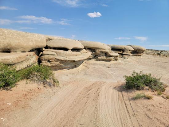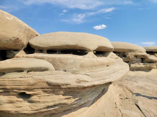 The Hamburger Rocks, also sometimes called the Mushroom Rocks is a roadside attraction in the northern San Rafael Swell region. The hamburger rocks are a clustering of white sandstone hoodoos with rounded tops and flat layers resembling hamburgers. The area makes for a quick stop to take some fun pictures on the way to Ghoul Gulch.