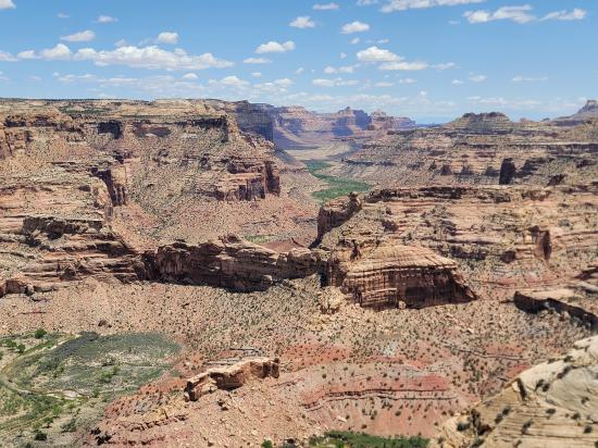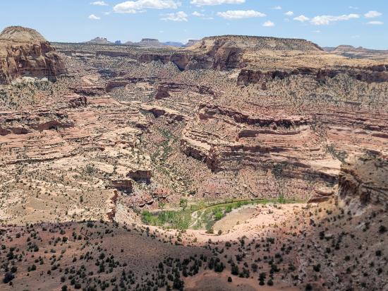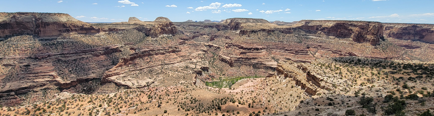 Located in the northern portion of the Swell, numerous viewpoints along the dramatic Overlook provide stunning views of varied landforms sculpted mainly in multi-colored sandstone formations. Directly beneath the Overlook is a shear drop off of 1,200 feet to the San Rafael River’s deeply cut Little Grand Canyon. Panoramic vistas reveal the river winding its way through canyons of changing widths, surrounded by multi- layered cliffs, buttes, domes, and spires.