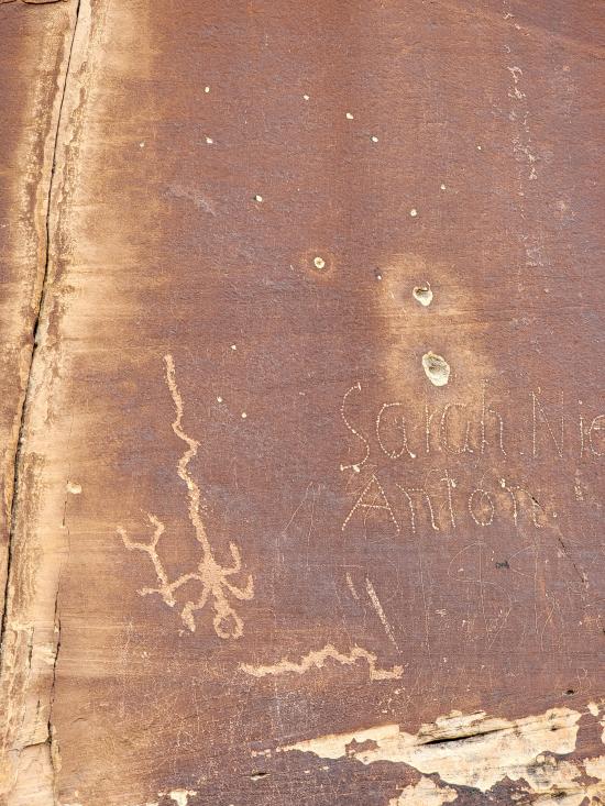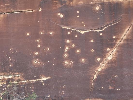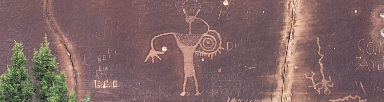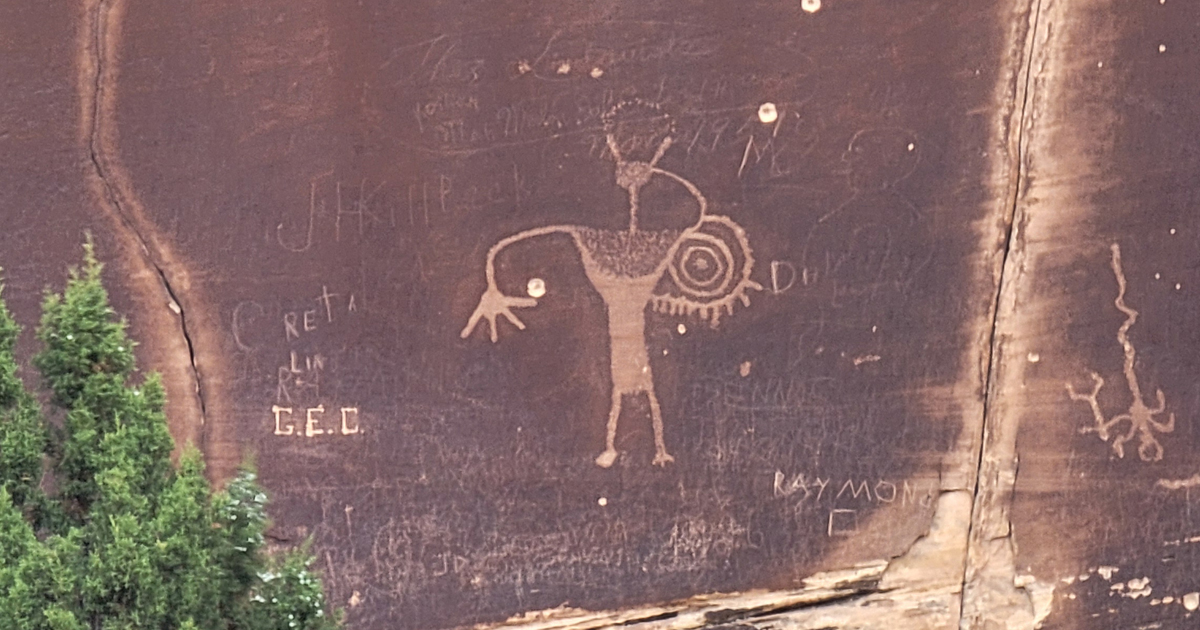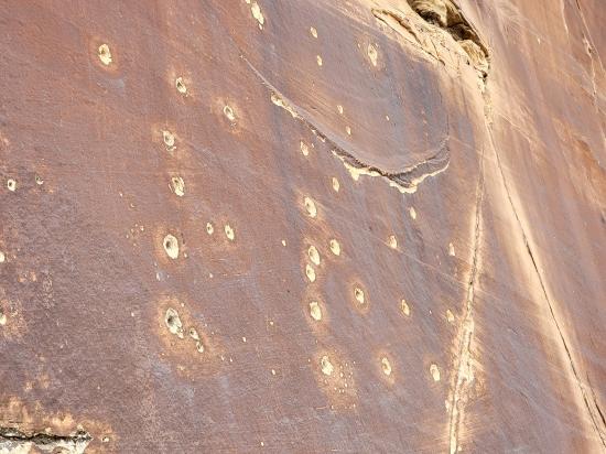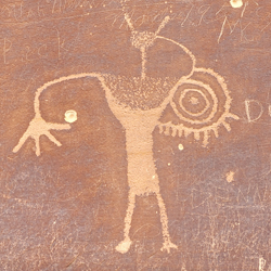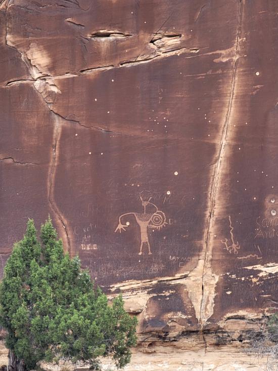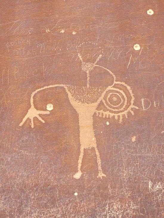 The TKG Petroglyph Panel, located in the San Rafael Swell area of Utah is a rock-art panel in Buckhorn Draw featuring an impressive Fremont petroglyph of an anthropomorph with a shield. The site takes its name from the initials TKG, which were shot into the rock near the panel. The TKG pane can be viewed from a pullout, or visitors can take a short walk to view the petroglyph up close.