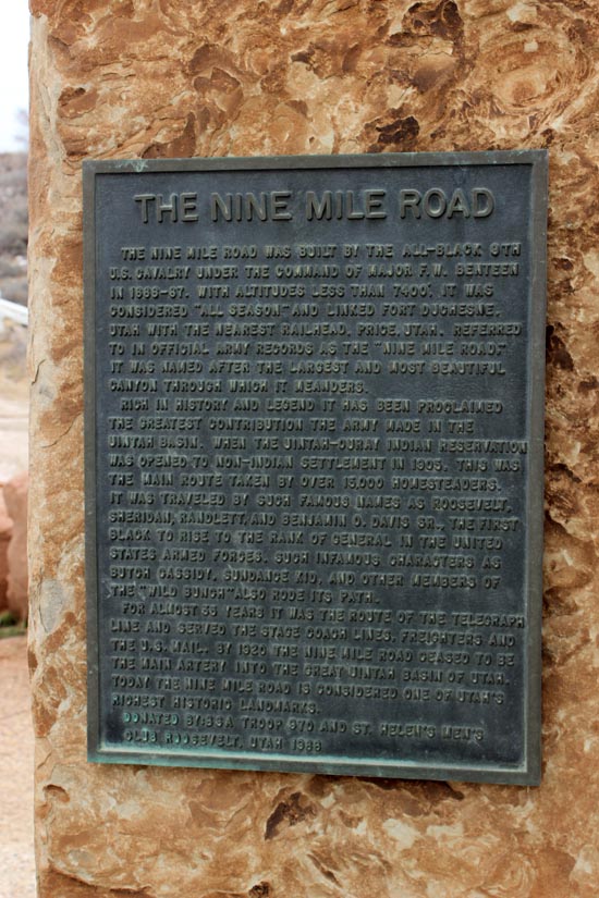 The nine mile road was built by the all-black 9th U.S. Cavalry under the command of Major F. W. Benteen in 1886-87. With altitudes wless than 7400', it was considered "all season" and linked Fort Duchesne, Utah with the nearest railhead, Prive, Utah. Referred to in official army records as the "Nine Mile Road," it was named after the largest and most beautiful canyon through which it meanders. Rich in history and legend it has been proclaimed the greatest contribution the army made in the Uintah Basin. When the Unitah-Ouray Indian Reservation was opened to non-Indian settlement in 1905, this was the main route taken by over 15,000 homesteaders. It was traveled by such famous names as Roosevelt, Sheridan, Randlett, and Benjamin O. Davis Sr,. the first black to rise to the rank of General in the United States Armed Forces. Such infamous characters as Butch Cassity, Sundance Kid, and other members of the "Wild Bunch" also rode its path. For almost 35 years it was the route of the telegraph line and served the stage coach lines, freighters and the U.S. Mail. By 1920 the Nine Mile Road ceased to be the main artery into the Great Uintah Basin of Utah. Today the Nine Mile Road is considered one of Utah's richest historic landmarks.