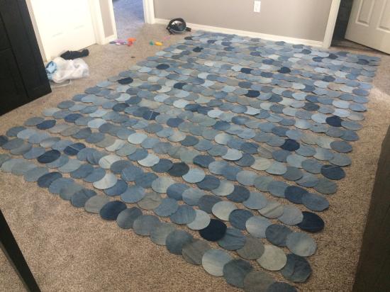 This one-of-a-kind picnic quilt is handcrafted from reclaimed denim jeans, transforming well-loved materials into a durable and visually striking textile. Rows of overlapping denim circles in varying shades of blue create a rhythmic, scale-like pattern that adds depth and movement across the surface. The natural variations in the denim—fades, textures, and tones—give the quilt its unique character and story. Designed for outdoor use, the quilt is both sturdy and soft, making it ideal for picnics, beach days, or casual gatherings. The recycled construction celebrates sustainability and resourcefulness, blending practicality with artistic design. Built to be used, washed, and enjoyed, this quilt honors the beauty of reuse while offering a comfortable place to gather and relax.