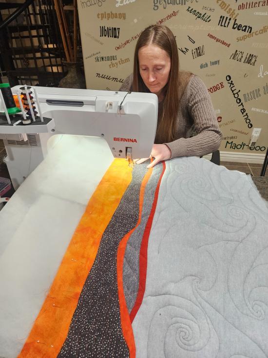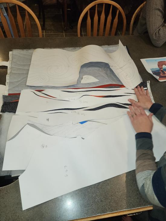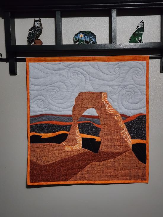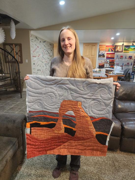 Tara and I made this landscape quilt of Delicate Arch with lots of help from my mom. It uses a technique of sewing each layer on top of the last one and quilting as you go.