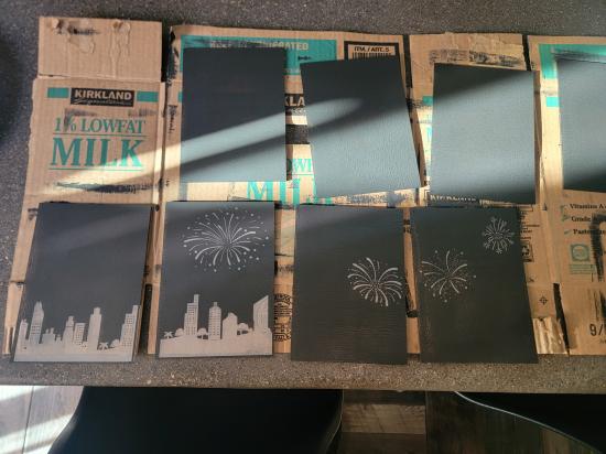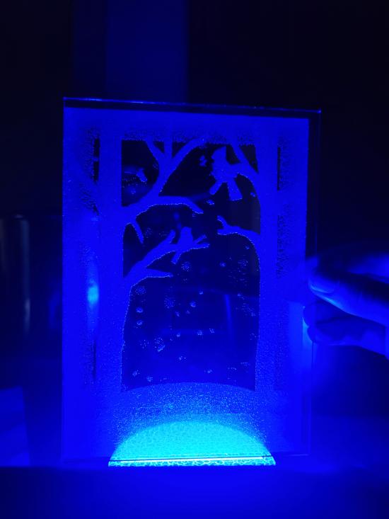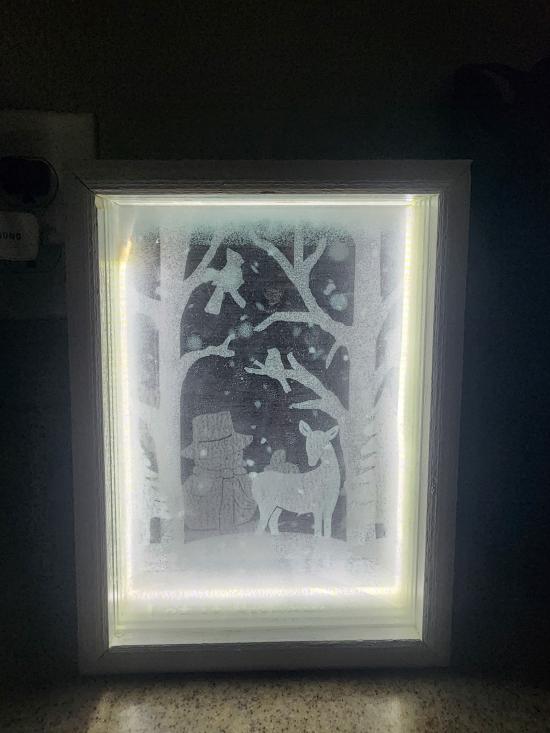 This handcrafted lightbox features a painted white wood frame housing a black backboard and four individually etched glass panels that slide neatly into place. Each glass layer contains a different element of the overall image, and when stacked together, they create a striking three-dimensional scene with depth, separation, and visual movement. An integrated LED light strip runs around the perimeter of the frame, softly illuminating the etched glass from behind. The light enhances the etched details and creates subtle shadows between layers, bringing the scene to life—especially in low light. This piece includes multiple interchangeable designs. The winter scene shown depicts a snowman, deer, and trees set within a quiet forest landscape. Additional etched scenes include butterflies drifting through tall grass, a city skyline illuminated by fireworks, and a Halloween graveyard with flying bats. Each scene transforms the lightbox into a unique seasonal or thematic display. Both decorative and technical in its construction, this layered glass artwork blends woodworking, glass etching, and lighting into a single immersive piece. Designed to be displayed on a shelf or wall, it offers a dynamic, glowing window into a carefully crafted miniature world.