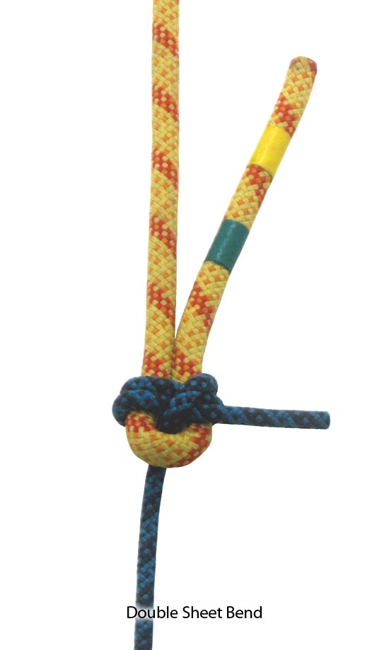 The double sheet bend is used to tie two ropes of different diameters together. The double sheet bend is a regular sheet bend with an extra twist, but It's still a variation on the square knot, and as such I would trust it with my gear but not with my life. One use for the double sheet bend is to tie a pull cord to a rappelling rope.