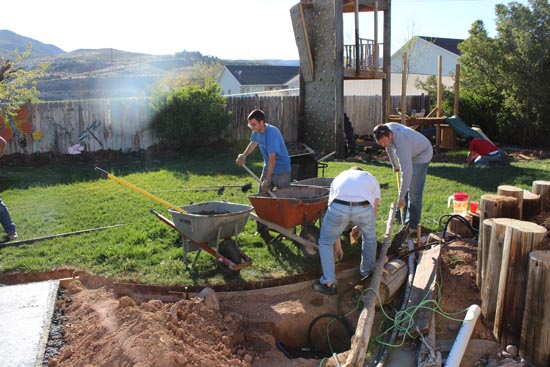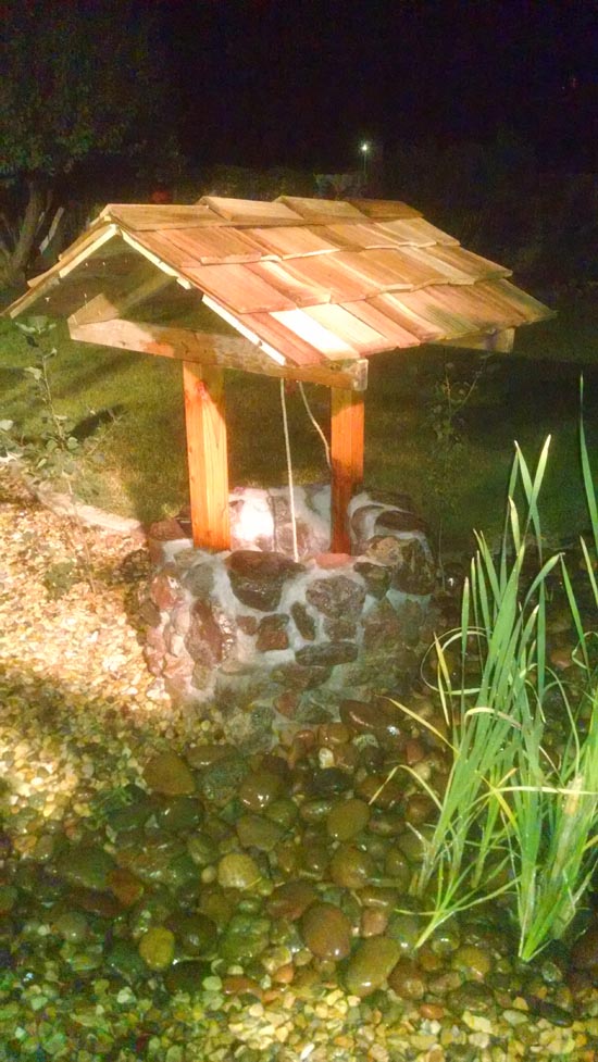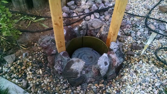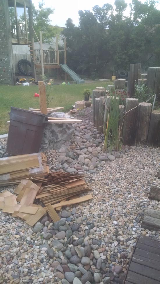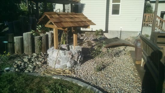 This worked out nicely because we had a bunch of leftover rocks from when we landscaped the front yard. You'll notice the design below also incorporates a small arched bridge over a dry creek bed.