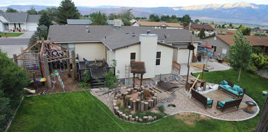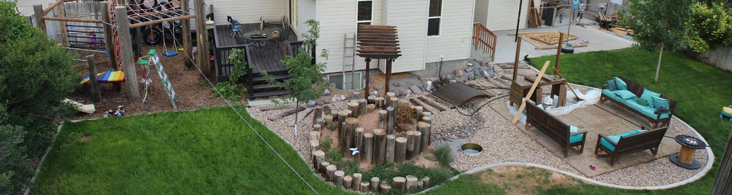 Our house was added onto several years ago. There is a concrete patio to the south of the addition and a wood deck to the north of the addition. In 2012/2013 we built a playground to the north of the deck. In 2013/2014, we are planning on building a rock climbing wall in the northwest corner of our back yard. There will be a zipline running from the rock climbing wall play center to the playground. These three high traffic areas make it fun and useful to add some garden paths to connect them.