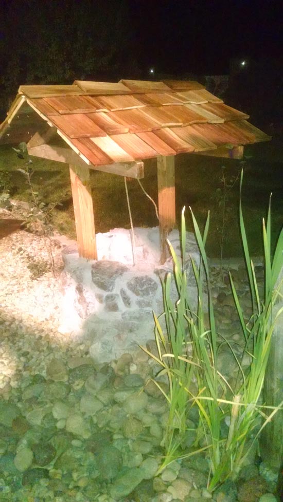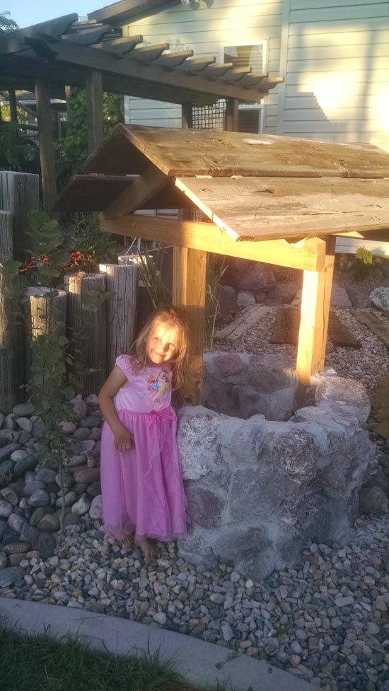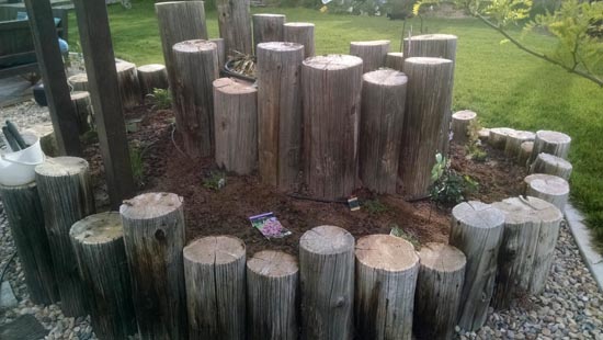 In the backyard, we added a railroad tie path from the back deck on the north side of the house to the patio on the south side of the house. We added some terraced flowerbeds, an herb spiral, a pergola trellis, a wishing well, several trees, and a patio.