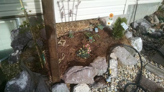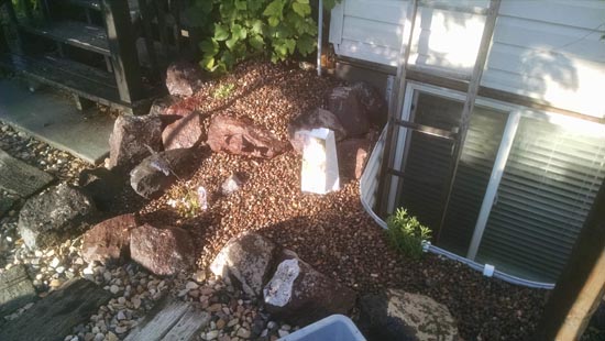 I mounded the dirt up against the house, put landscaping fabric down, then placed the landscaping rocks. I'm a big fan of landscaping fabric. It's the only way to keep the weeds manageable.