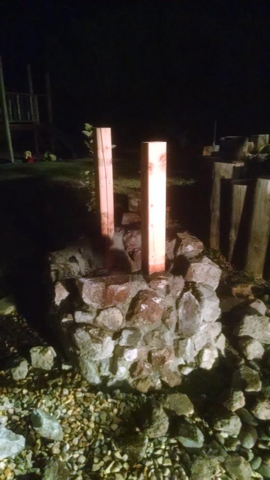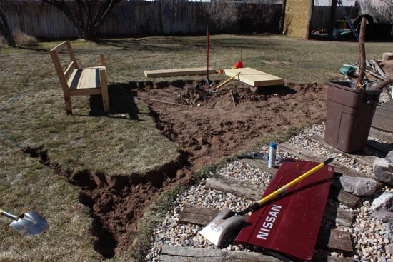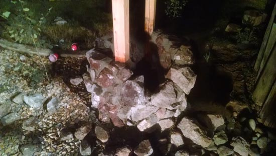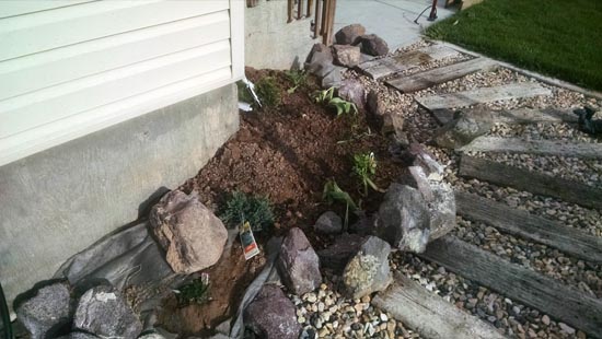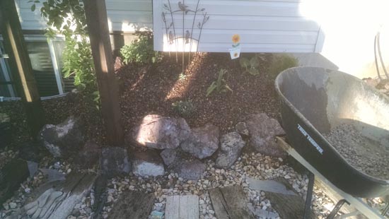 There ended up being a shortage of surplus utility poles, so we decided to use rocks to retain the raised bed up against the house.