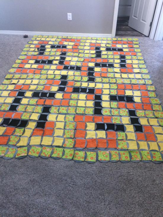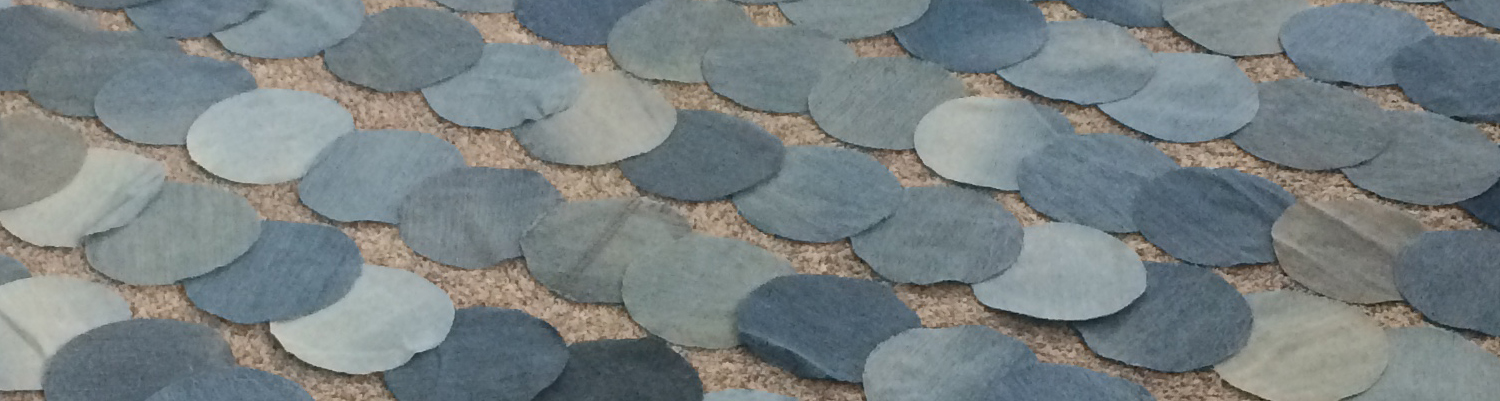 This one-of-a-kind picnic quilt is handcrafted from reclaimed denim jeans, transforming well-loved materials into a durable and visually striking textile. Rows of overlapping denim circles in varying shades of blue create a rhythmic, scale-like pattern that adds depth and movement across the surface. The natural variations in the denim—fades, textures, and tones—give the quilt its unique character and story. Designed for outdoor use, the quilt is both sturdy and soft, making it ideal for picnics, beach days, or casual gatherings. The recycled construction celebrates sustainability and resourcefulness, blending practicality with artistic design. Built to be used, washed, and enjoyed, this quilt honors the beauty of reuse while offering a comfortable place to gather and relax.