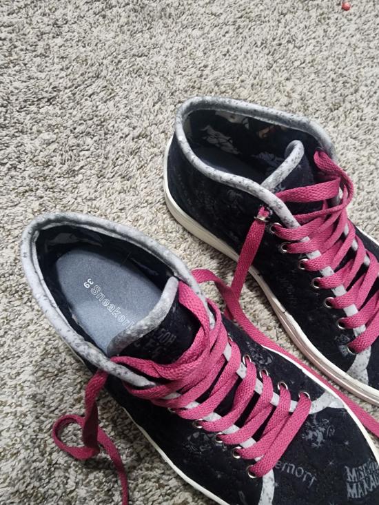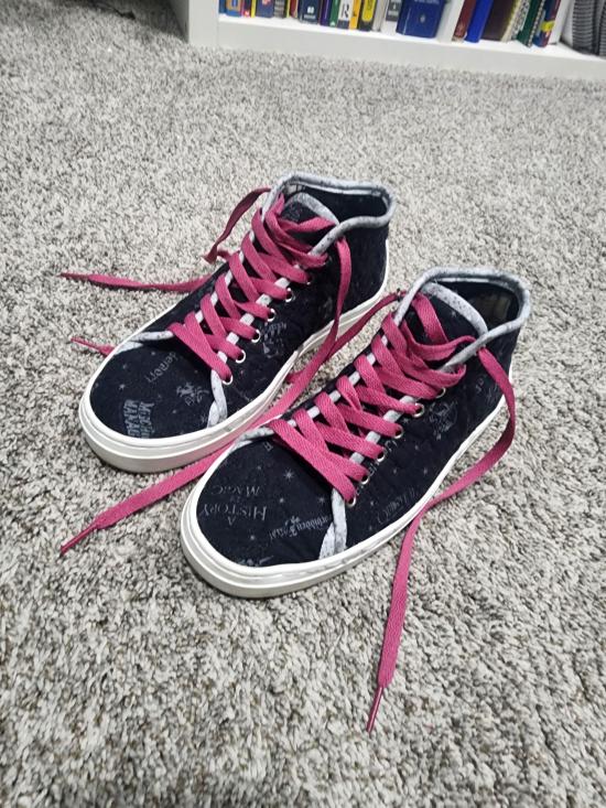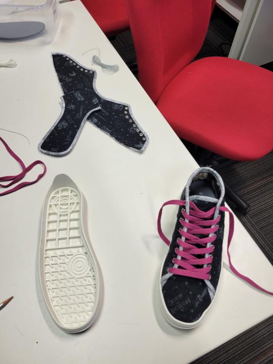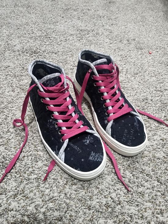 These homemade shoes are a one-of-a-kind, Harry Potter–inspired creation, handcrafted from start to finish. The uppers are sewn from dark, wizard-themed fabric featuring subtle magical motifs, giving the shoes a mysterious, nighttime feel reminiscent of the Wizarding World. The interior is fully lined for comfort, and metal eyelets add durability while enhancing the handmade, custom look. Bright magenta laces provide a bold contrast against the dark fabric, adding personality and a modern twist to the magical theme. The shoes are built on sturdy white rubber soles, which were attached separately, showing the construction process and craftsmanship involved in making footwear entirely by hand. From pattern pieces to final assembly, these shoes showcase creativity, sewing skill, and fandom combined into a wearable art piece—functional, comfortable, and truly unique for any Harry Potter fan.
