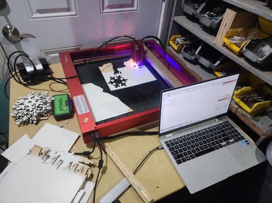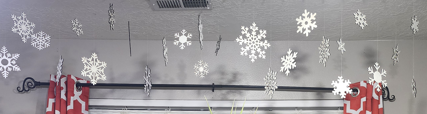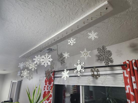 These decorative snowflakes are laser cut from wood, creating crisp, clean lines and intricate winter-inspired patterns. Each snowflake features a unique design, highlighting the precision of the laser cutting and the natural character of the wood grain beneath the painted finish. Suspended individually from clear line, the snowflakes appear to float in the air, forming a layered, drifting display reminiscent of falling snow. Lightweight yet sturdy, these wooden snowflakes are ideal for hanging displays, window décor, or festive installations. Their handcrafted quality and detailed designs make them a timeless winter decoration that can be reused year after year.